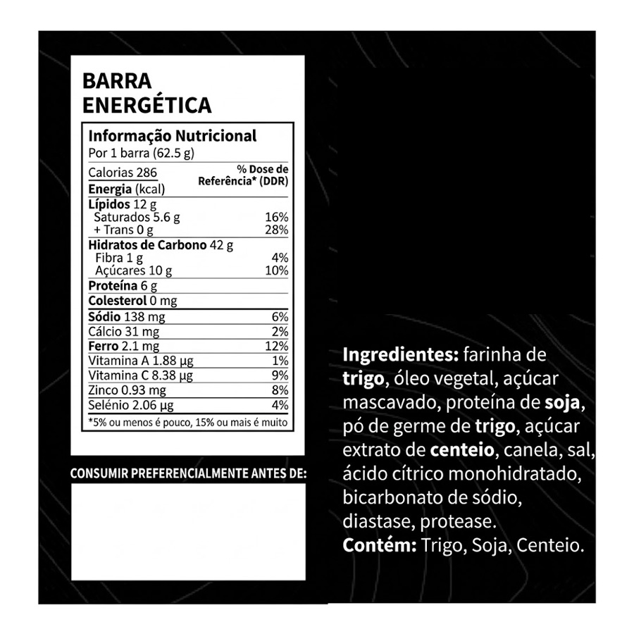 Barritas de emergência, sem aromatizantes, com vitaminas e minerais adicionados. Uma embalagem contém 500g (8 barritas de 62.5g), num total de 2428kcal.