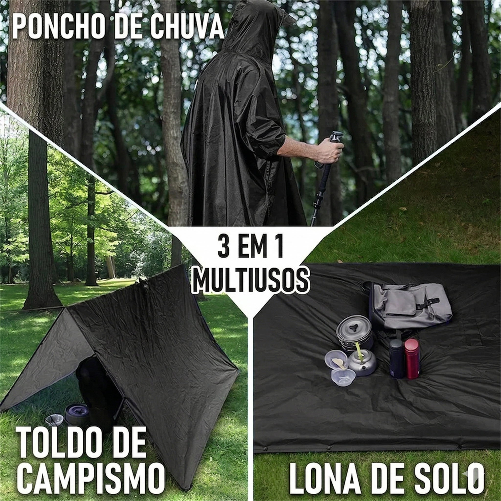 Poncho de chuva multiusos: serve de capa da chuva, toldo, e lona. Pode usar-se com mochila às costas.